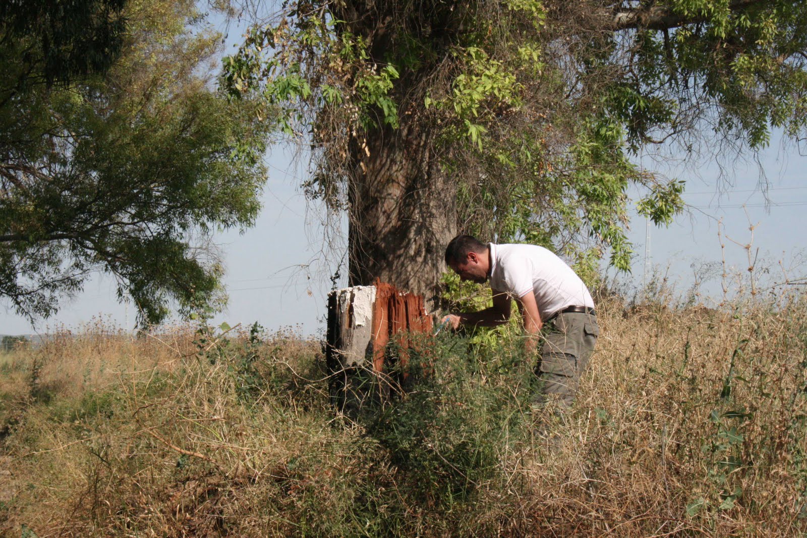 Se trata de una acción que consiste en abatir un árbol seco a disparos hasta hacerlo caer y registrar todas las huellas de este acontecimiento, El artista vino provisto de materiales para realizar un molde tanto de la pieza que se quiebra como del trozo de arbol que ha quedado en la tierra, parte del trabajo realizado servirá para una escultura pública que le han encargado en Ámsterdam en honor de un héroe de la segunda Guerra mundial y por otro lado el grueso del proyecto que se realizó se podrá ver a partir de Enero en el Centro de Arte contemporáneo de Málaga, El paraje elegido para realizar la acción fue el Callejón del barco, Junto a la ribera de El Guadalquivir, la pieza se ejecutó entre los días 3 al 7 de Julio, El Eucalipto seco tiene una longitud de unos 10 metros y será trasladado al CAC de málaga para exhibirlo junto con todo el material que el artista desarrollará, según nos indica se realizarán varias piezas en Bronce , un Vídeo, fotografía y documentación que ha servido al artista para llevar a cabo esta acción, teniendo en cuenta que este tipo de acciones parten de mediados de siglo donde el inventor de la metralleta hacia demostraciones de este tipo para que se valorase la validez de el arma,